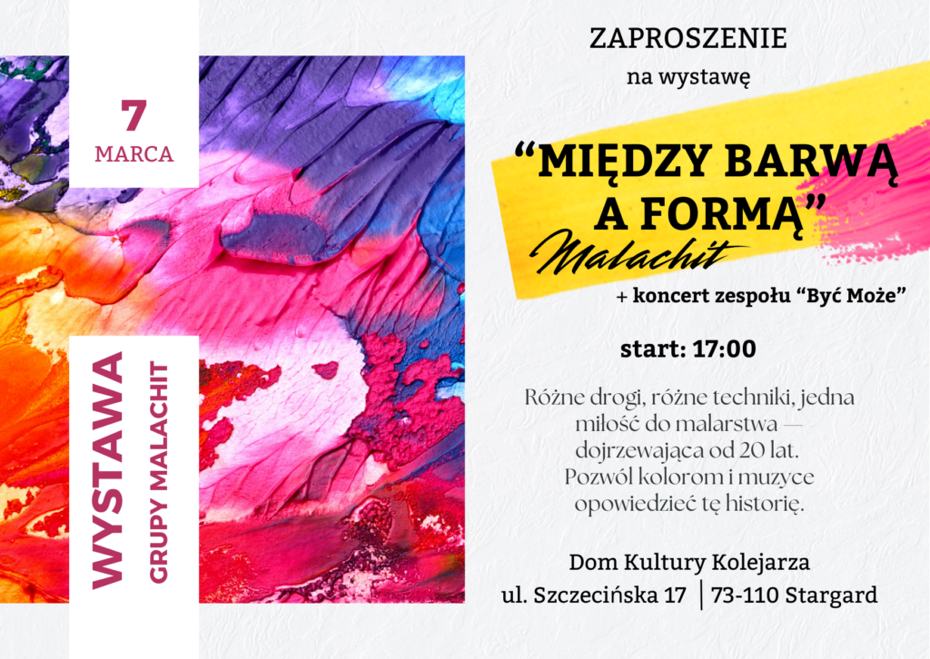 Już 7 marca o godz. 17:00 zapraszamy do Domu Kultury Kolejarza w Stargardzie na wyjątkowy wieczór ze sztuką. Wystawa grupy Malachit to spotkanie z malarstwem pełnym emocji, odwagi i twórczej dojrzałości.